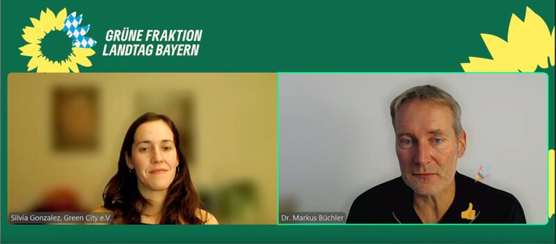 Dr. Markus Büchler, MdL diskutierte mit Silvia Gonzalez, Referentin für Klima und Stadtgestaltung bei Green City e.V., welche Rahmenbedingungen Gemeinden schaffen können, um Bürgerprojekte im Bereich Verkehr und Begrünung zu ermöglichen. Es ging um Fragen von Versicherung/Haftung, Verträgen, der politischen Zustimmung. Auch Finanzierungfragen, Förderprogramme und Beteiligung der Anwohnenden wurden angesprochen.