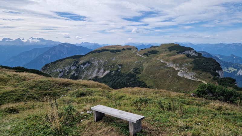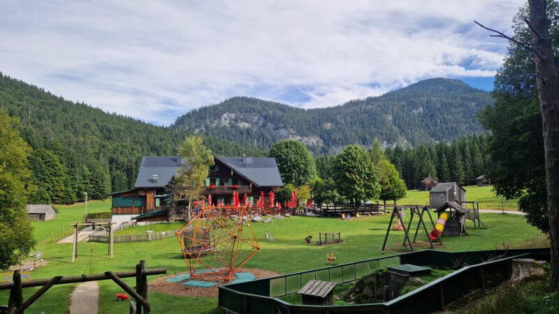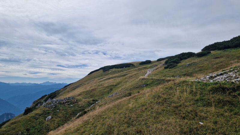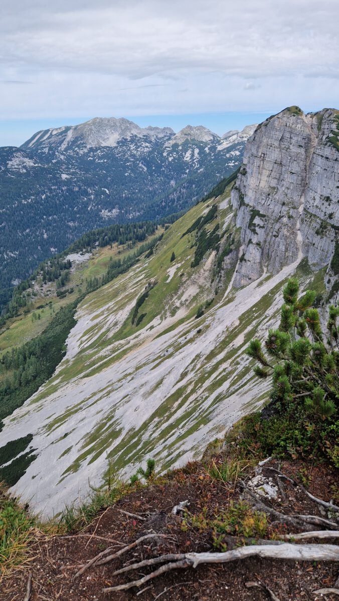 Jetzt aber zur Tour. Zum Loser geht es von hier 900 Höhenmeter bergauf. Der Beginn ist gleich bei der Blaa-Alm rechter Hand bei einem Holzhütterl. Durch den Wald geht es hinauf, folge der Karte auf deiner App über den Brombeerkogel. Unterhalb des Losergipfels eröffnen sich immer mehr Ausblicke auf den Altausseer See und die umliegenden Berge bis zum Dachstein. Letzterer gut erkennbar am traurigen Gletscherrest. Noch.