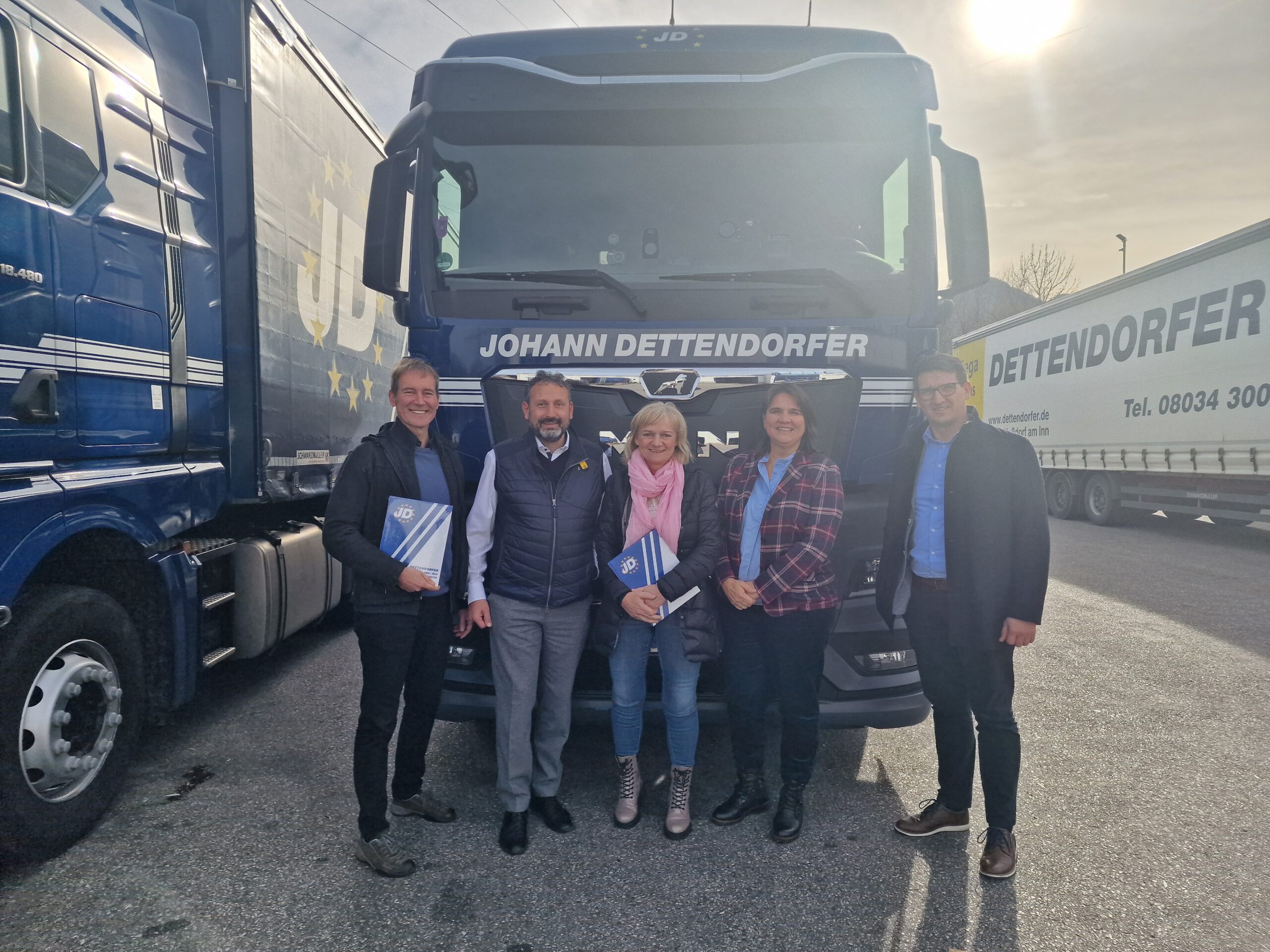 Klimaschutz und LKW müssen kein Widerspruch sein. Denn auch im Schwerlastverkehr hat die Antriebswende hin zu klimaneutralen Kraftstoffen längst begonnen. Besonders engagiert ist dabei das Traditionsunternehmen Dettendorfer aus Nussdorf am Inn. Bei einem Besuch der beiden Landtagsabgeordneten Claudia Köhler und Dr. Markus Büchler, zusammen mit der Rosenheimer Grünen OB-Kandidatin Anna Rutz und Christoph Schuler vom LKW-Hersteller MAN hat Firmeninhaber Georg Dettendorfer einen Einblick in die Erfolge und Herausforderungen seines Unternehmens aufgezeigt.