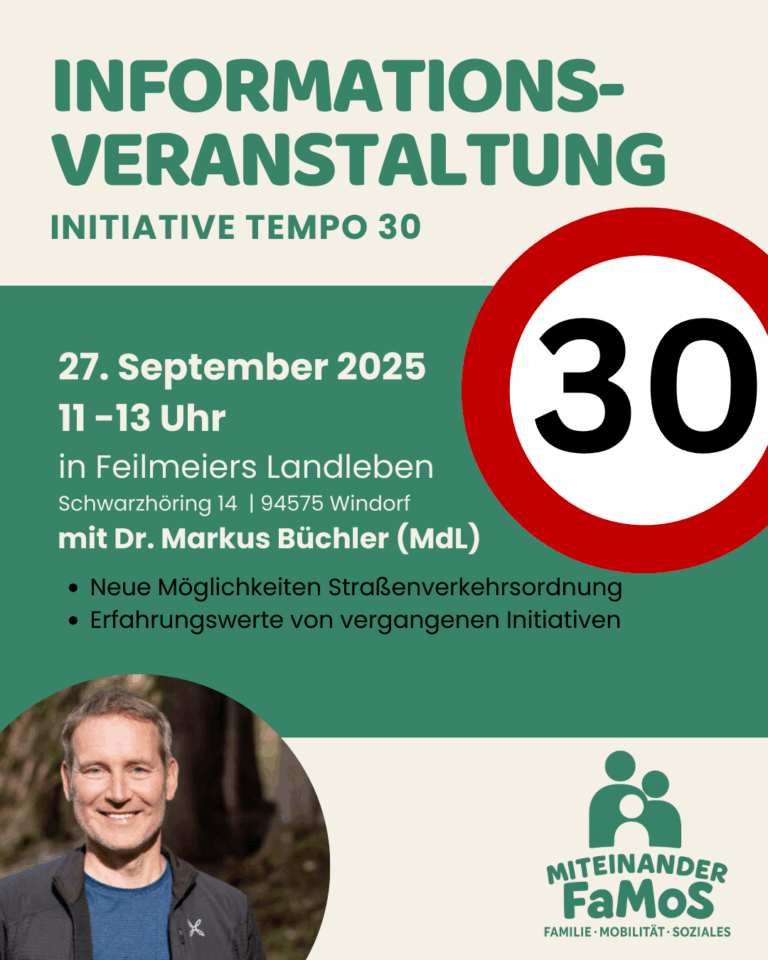 Schwarzhöring: Informationsveranstaltung zu Tempo 30 Dr. Markus Büchler ist zu Gast bei der Initiative „Miteinander Famos“ in Schwarzhöring. Wir tauschen uns vor Ort aus zu den Themen Thema Tempo 30, Verkehrsberuhigung und die Möglichkeiten der […]