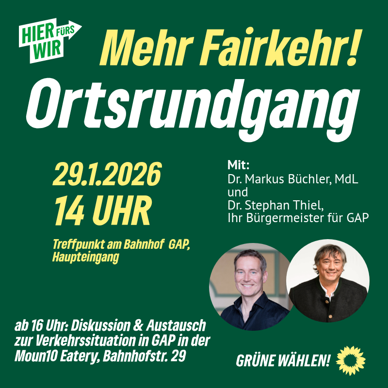Am 29. Januar um 14 Uhr laden de Grünen Garmisch-Partenkirchen gemeinsam mit ihrem grünen Bürgermeisterkandidaten Dr. Stephan Thiel zu einem Ortsrundgang in Garmisch-Partenkirchen ein. Treffpunkt ist am Bahnhof.