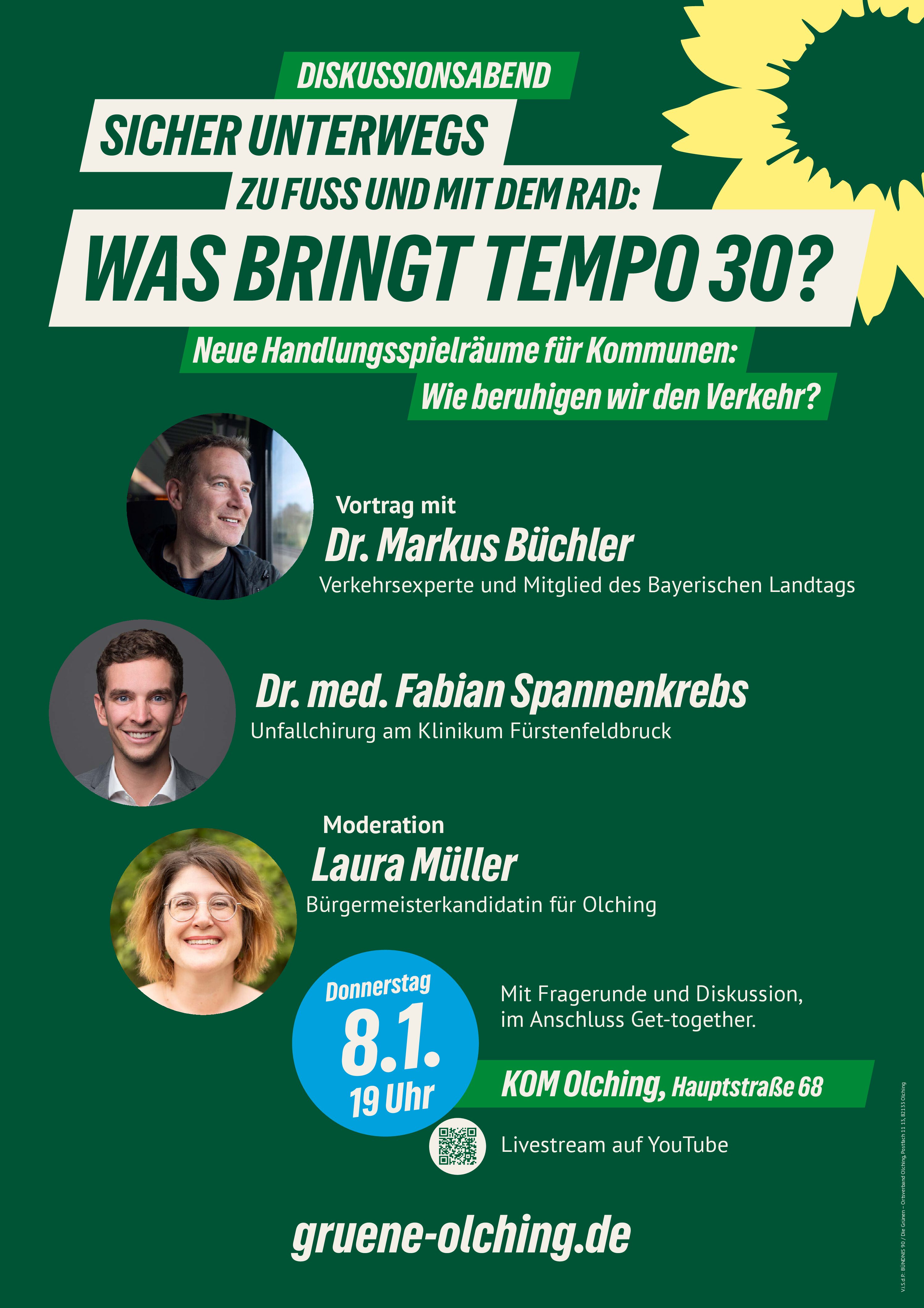 Als Referenten konnten Dr. Markus Büchler sowie Dr. med. Fabian Spannenkrebs, Unfallchirurg am Klinikum Fürstenfeldbruck, gewonnen werden. Die Moderation übernimmt Laura Müller, Olchinger Bürgermeisterkandidatin von BÜNDNIS 90/DIE GRÜNEN.